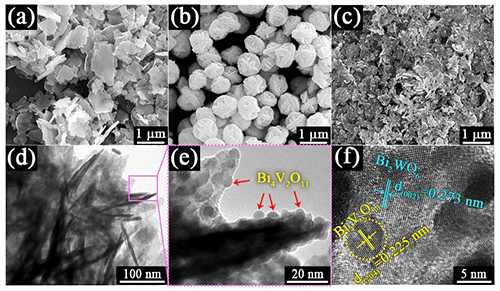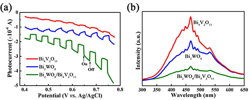 另外,从光电流强度测量(图3-a)和光致发光谱分析(图3-b)结果来看,相比纯Bi2WO6和纯Bi4V2O11样品,Bi2WO6/Bi4V2O11异质结光催化剂有效地抑制光生电子-空穴的再复合,并显著提高分离效率。