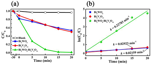 然后,在可见光(λ>400nm)下光催化分解有毒性重金属Cr(VI)离子的实验结果表明,在光照时间20min内,Bi2WO6/Bi4V2O11异质结光催化剂对Cr(VI)离子的光催化分解率达到100%,然而利用纯Bi2WO6和纯Bi4V2O11样品的时候,其分解率只有46%和50%。(图2-a)而且如图2-b所示,Bi2WO6/Bi4V2O11异质结光催化剂的光催化反应速度较纯Bi2WO6和纯Bi4V2O11约高为10倍。
