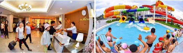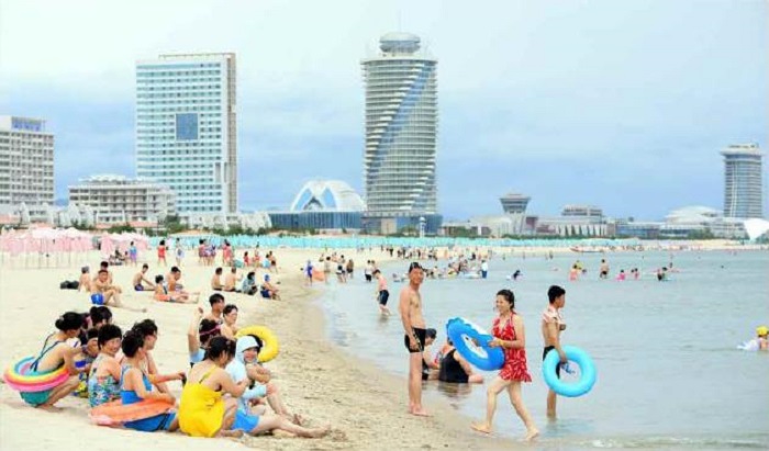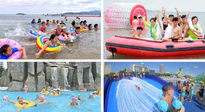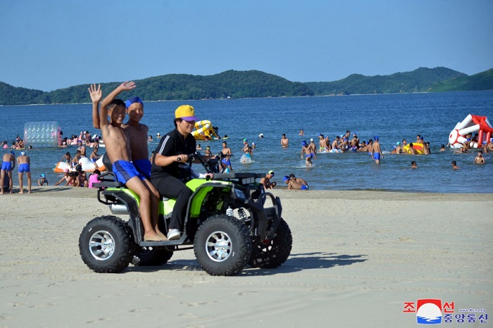 출렁이는 바다물에 몸을 잠그고 해수욕을 하는 근로자들과 물스키와 고속뽀트를 타는 사람들의 기백넘친 모습들도 볼만 하지만 백사장에서의 오토바이타기와 모래터배구도 손님들의 눈길을 끌고있다.
