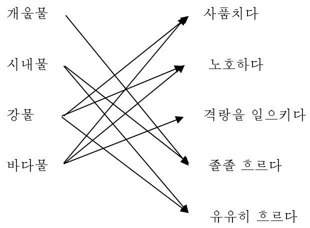 우의 도식을 통하여 의미성격의 정도가 심화되는데 따라 단어들의 결합도 그에 맞게 이루어지는것을 알수 있다. 실례로 《바다물이 격랑을 일으킨다.》는 가능하지만 《개울물이 격랑을 일으킨다.》는 불가능하다는것을 의미성격의 정도상의 특징을 가지고 충분히 설명할수 있다.